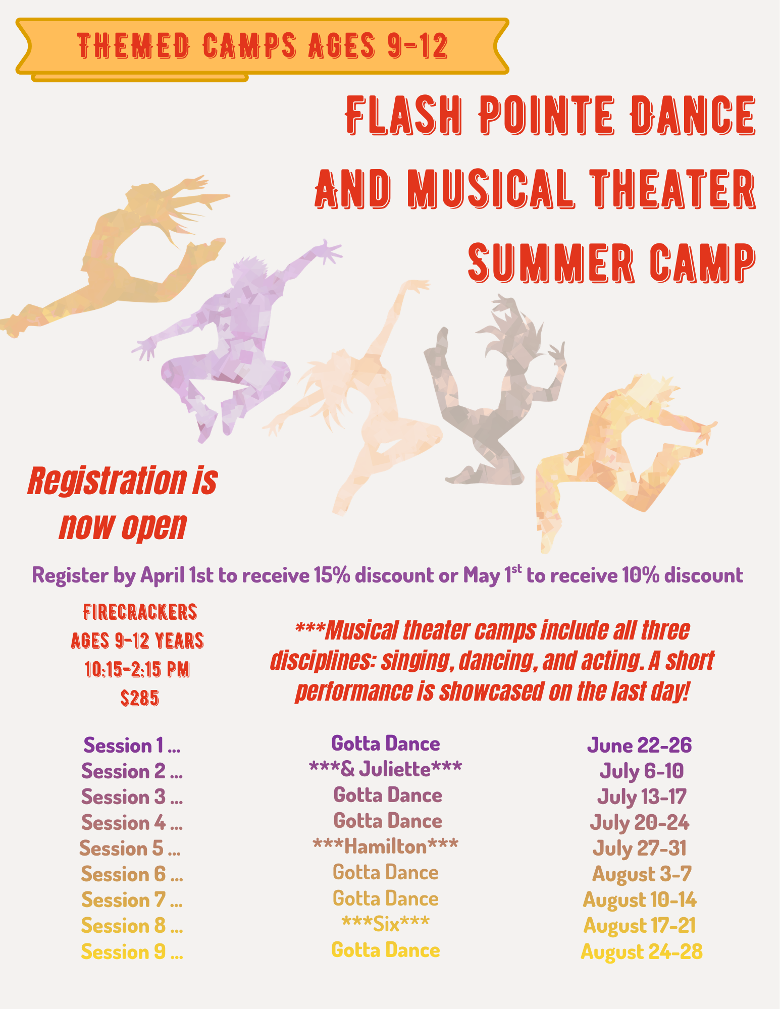 Sparklers (ages 3-5) explore Ballet, Jazz, Tap, and Hip-Hop. Fireflies (ages 6-8) and Firecrackers (ages 9-12) explore Ballet, Jazz, Stretch & Strength, Hip-Hop, Tap, Lyrical, and Musical Theater. Firecrackers have the option of two Musical Theater camps involving theater dance, singing, and acting training which culminates in a short performance on the last day. Each group ends the day with lunch and a creative craft to round out the day in a fantasy inspiring way.